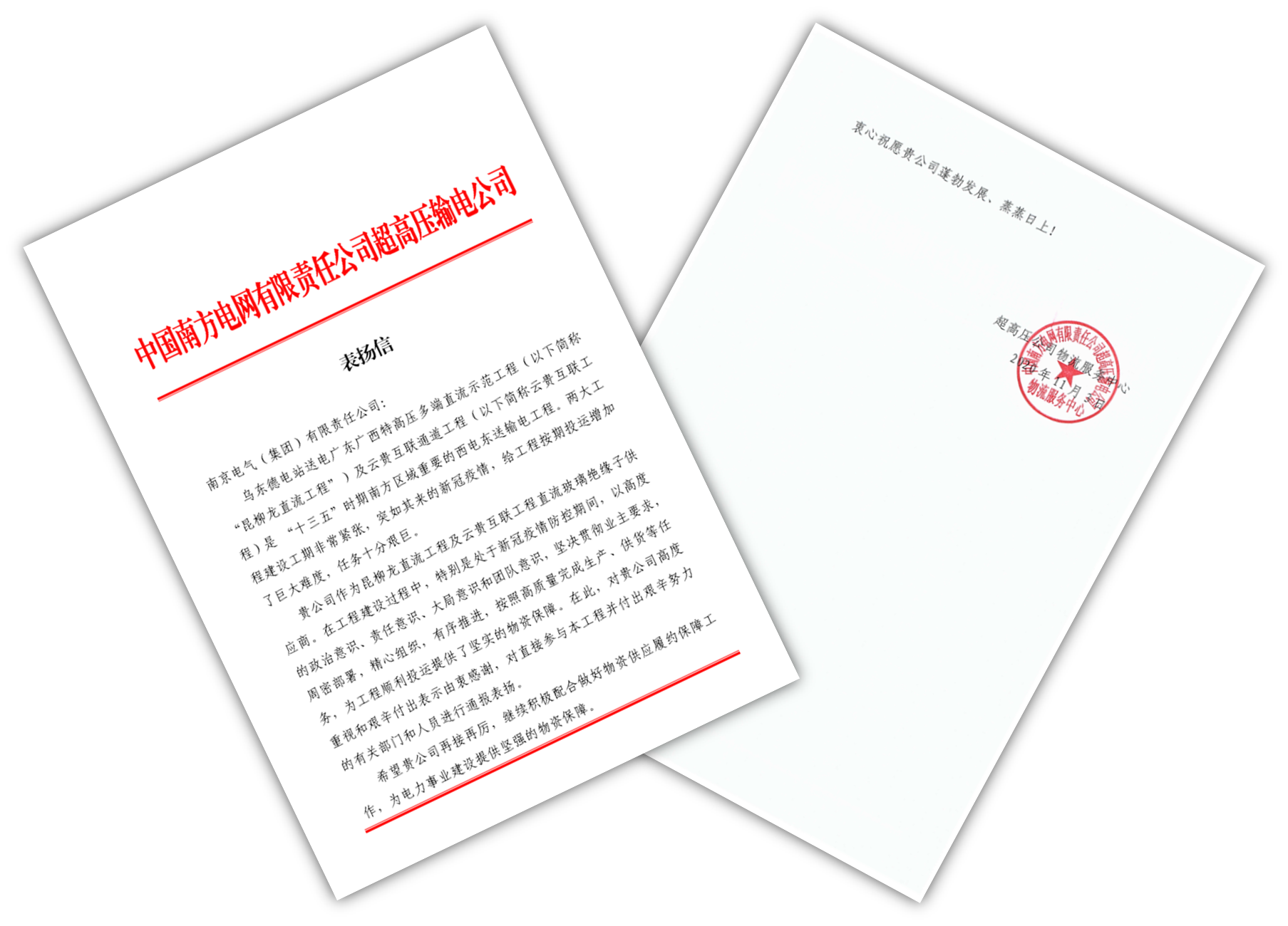 南網(wǎng)超高壓公司向南京電氣致表揚(yáng)信