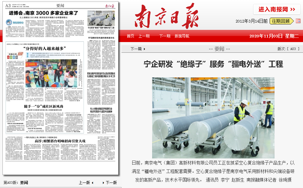 10月28日和11月3日,南報融媒旗下的紫金山新聞客戶端和南京市委黨報《南京日報》分別對南京電氣研發(fā)生產(chǎn)空心復(fù)合絕緣子新產(chǎn)品、服務(wù)國家重點工程做了報道。 10月28日,“紫金山新聞”發(fā)布消息《南京電氣研...