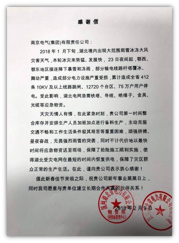 安徽、湖北兩省電力物資公司近日向南京電氣(集團)有限責任公司發(fā)來感謝信,感謝南京電氣在1月下旬為兩省雪災電力搶修做出的貢獻。 1月23日開始,安徽、湖北等地連續(xù)遭受特大冰雪災害,部分輸電線路嚴...